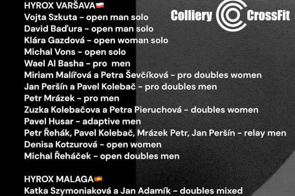 Závodní víkend pro COLLIERY. O nadcházejícím víkendu máme závodní zastoupení rovnou na třech místech ve třech státech! … O nadcházejícím víkendu máme závodní zastoupení rovnou na třech místech ve třech státech! ATHENS throwdown HYROX Varšava HYROX Malaga Všem držíme palce a fandíme na dálku!